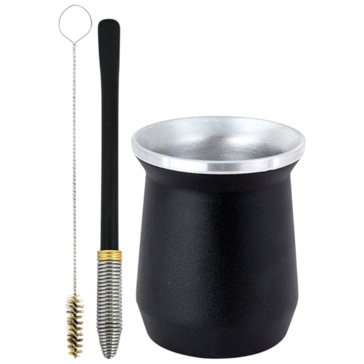 O copo tipo cuia é fabricado 100% em alumínio escovado, com acabamento preto fosco, resistente e elegante. Com 236ml de capacidade, é ideal para saborear o tereré com conforto e estilo, sem transferir gosto nem cheiro.